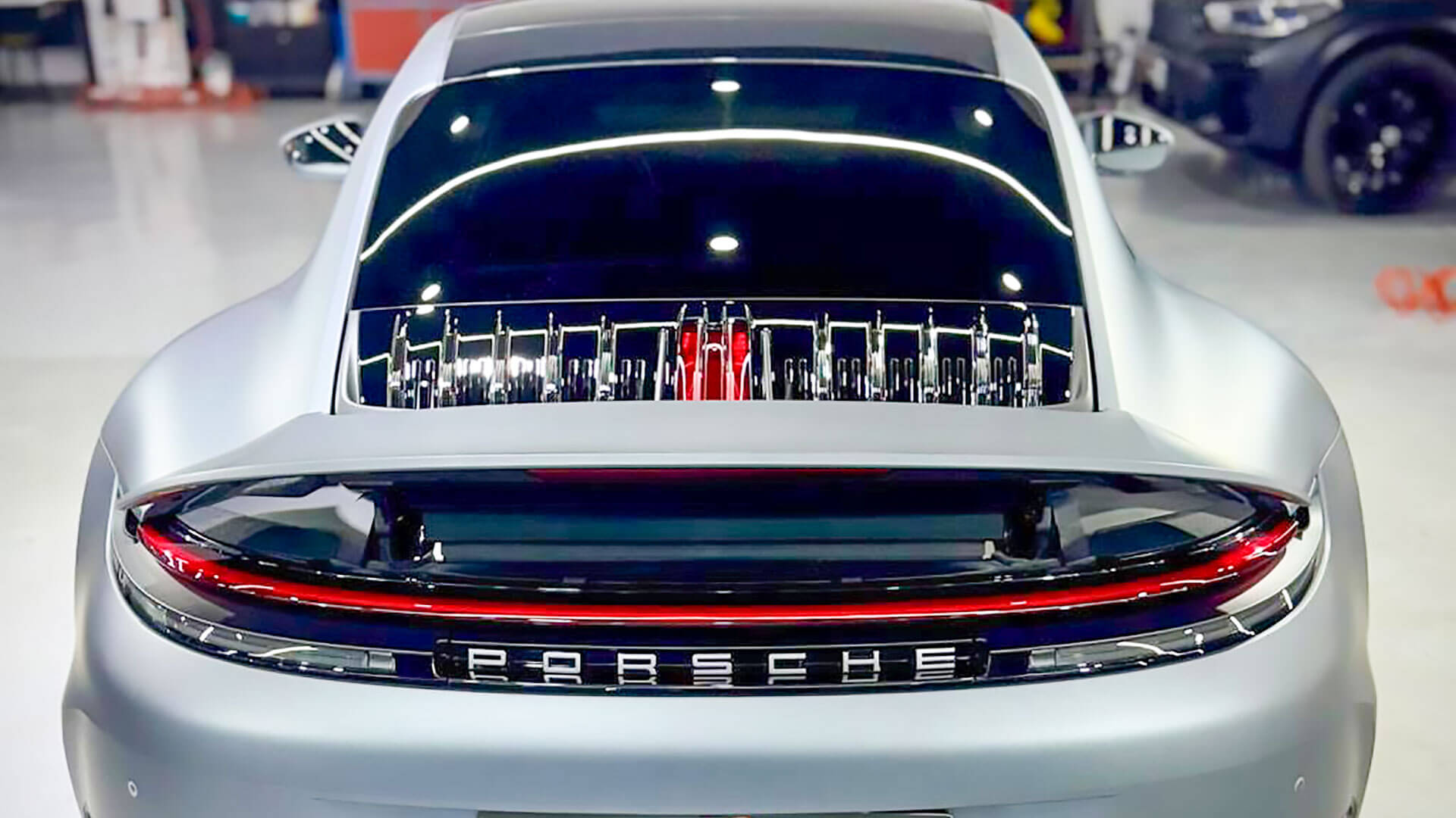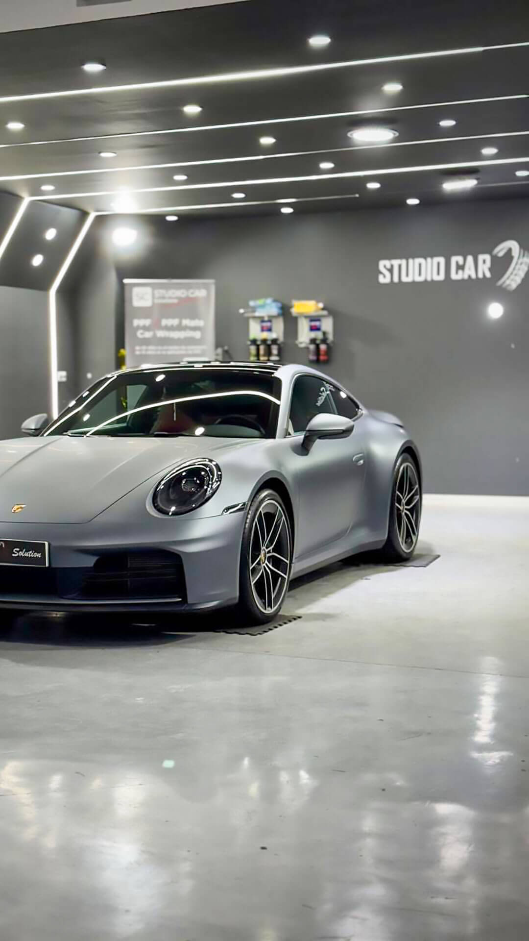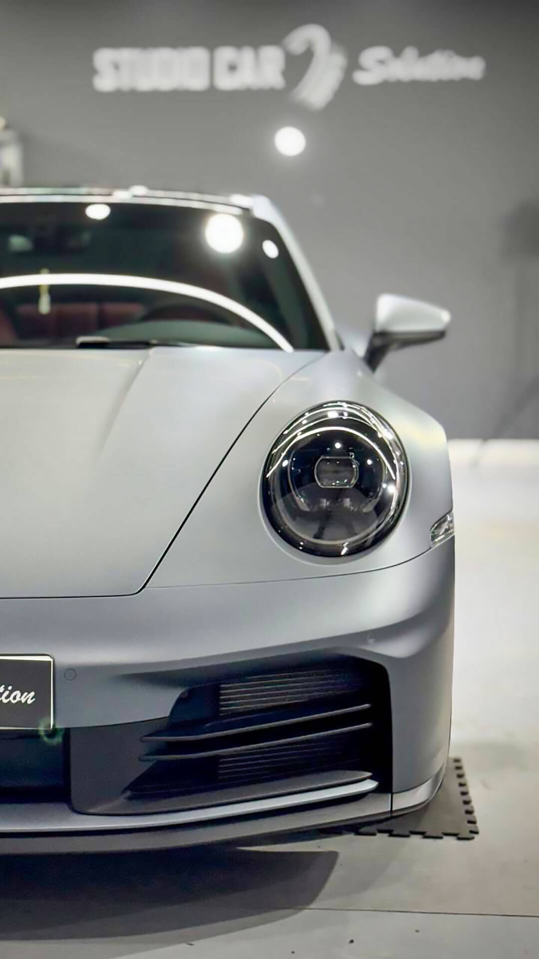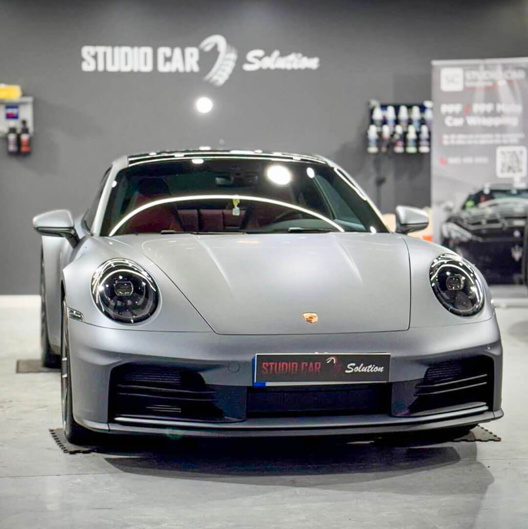 Para ayudarle a visualizar el efecto real, aplicamos PPF Mate en una sección del coche. El resultado fue inmediato: el Porsche pasó de tener un aspecto pulido y brillante, a una estética mucho más sobria, deportiva y exclusiva. Las líneas agresivas del diseño ganaron profundidad, y el coche adoptó una apariencia satinada que llamaba la atención sin necesidad de brillar.